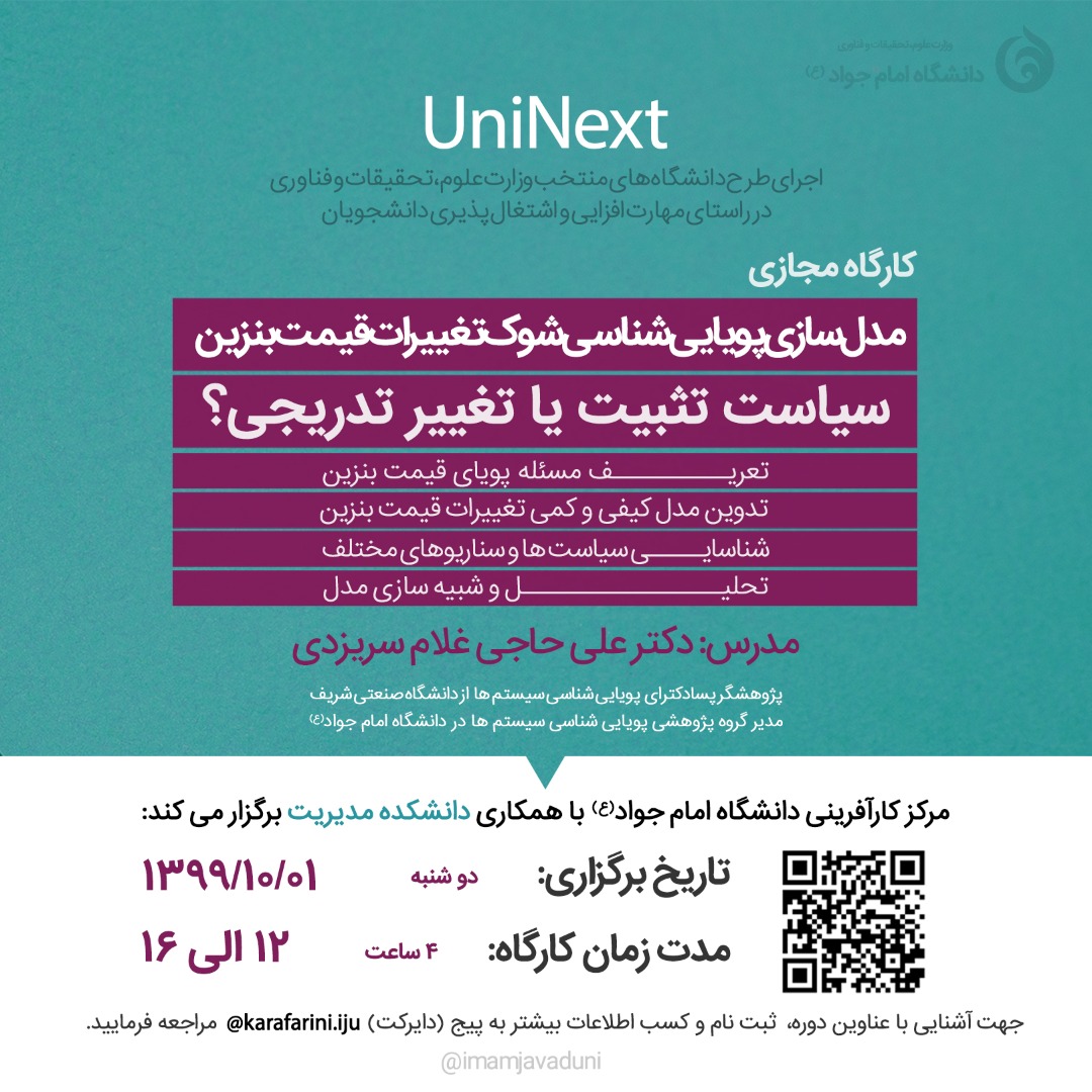 - کارگاه آموزشی "پویایی شوک تغییرات قیمت بنزین: سیاست تثبیت یا تغییر تدریجی؟" بصورت مجازی، طرح Uni-Next موسسه امام جواد (ع) یزد، یزد، 1 دی 1399 (4 ساعت).